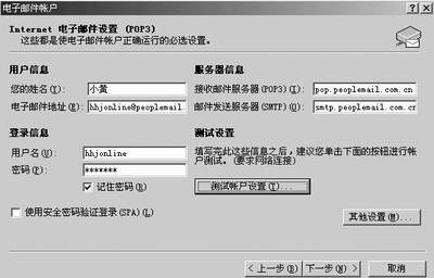 1.设置邮件发送和接收账户:这一步就是将你个人邮箱的信息填写到Outlook中。在家办公,与外界沟通的途径当然是互联网和电子邮件,所以设置正确的邮件发送和接收账户,就显得尤为重要。执行“工具”菜单中的“电子邮件账户”命令,在弹出的窗口中选择“添加新电子邮件账户”,点击“下一步”按钮后即可弹出“电子邮件账户”窗口,在该窗口中填写姓名、电子邮件地址、用户名、密码、以及接收和发送邮件的服务器(这个可以在提供邮箱的网站中查到),如图1所示。填写完毕后,为了判断自己填写得是否正确,可以点击“测试账户设置”按钮,如果提示“祝贺你!已完成所有测试”,那就说明设置成功了。如果有多个邮箱,那就重复这一操作,直到所有地址都添加完毕。