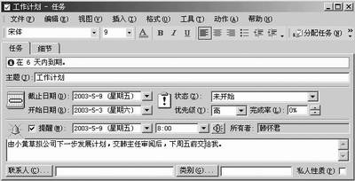 老板在自己的计算机中运行Outlook 2002,点击界面左侧Outlook面板中的“任务”图标,进入“任务”窗口,在其中的任务列表中输入本次任务的主题内容(如工作计划),按回车键后,该任务就会被添加到任务列表中。然后双击此任务,在如图2所示的窗口中输入任务的内容,设置任务的优先级和提醒时间等。