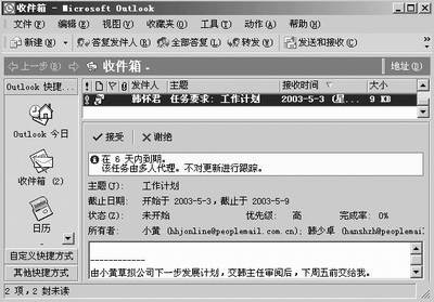 收件人(如韩少卓)收到分派任务的信件后,单击收件箱中包含任务的信件,如图3所示,这时窗口中就会多出“接受”和“谢绝”两个按钮。没说的,当然点击其中的“接受”按钮,任务就被添加到任务接受者的Outlook中。在单人任务中,任务接受者每次对进度的更新都会被Outlook自动报告给发布者(关于Outlook对任务管理的详细介绍,大家可以参考《电脑报》2003年第3期和第5期中的相关文章《Outlook让管理更轻松》,这里就不再多说了)。