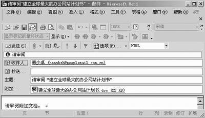 部门领导在接到这封邮件后,双击“附加”框中计划书的Word图标,在接下来弹出的关于附件的处理方式窗口中选择“打开”,确定后,计划书就自动用Word打开了。当然,也可以先保存到硬盘上,再打开进行修订。