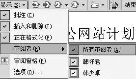 如果还有其他人对文件进行了修订,比如将原文中的“公办”改为“办公”,如图8所示,所做的修改将以另一种颜色显示出来。另外,在“审阅”工具栏中,单击“显示”,在下拉菜单中的“审阅者”栏目里,我们可以通过点击审阅者名字前边的复选框(图9),实现在页面中只显示特定审阅者所作的修订。