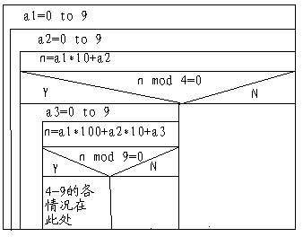 为了更加便于初学者学习和模仿,N—S图我们只给到第三重循环(如图),其他的几重循环的特点跟前面(2)和(3)重循环相似,在第九重循环内的分支的Y部分,则是输出a1、a2到a9组成的数字的语句。请你根据题目自己向下画画试试吧。
