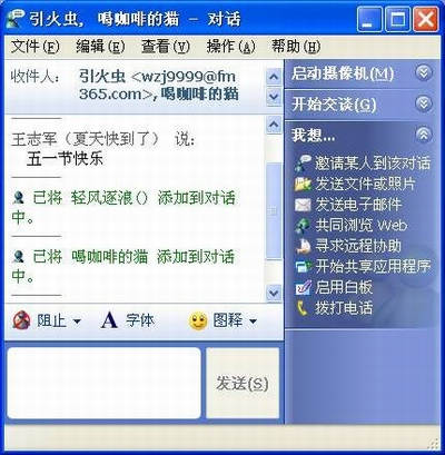 我们也可以利用MSN Messenger的“邀请某人到该对话”功能实现会议功能,点击右侧任务列表中的“邀请某人到该对话”项,如果看不到该侧栏,请从“查看”菜单中激活“显示侧栏”项,然后在图5所示对话框中,双击某个联系人的名字,就可以将他邀请到本次对话中。