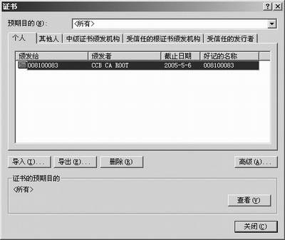 不同机构的证书安装稍有差别,国内机构的数字证书一般先要安装一个CA数字证书,然后再安装包含私钥的数字证书。安装的方法非常简单,双击得到的证书文件,然后根据提示操作就行了。安装好后,可启动IE浏览器,选择“工具”菜单中的“Internet选项”命令,在弹出的选项对话框中单击“内容”标签中的“证书”按钮,你就可以在“证书”对话框中看到你所安装的数字证书(图1)。安装好了证书后你就可以在OE和Word中使用它了。