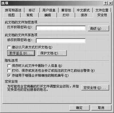 在Word的“工具”菜单中单击“选项”命令,并在弹出的“选项”对话框中选择“安全性”标签,单击其中的“数字签名”按钮(图2)。