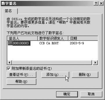 在“数字签名”对话框(图3)中单击“添加”。然后在证书列表中选择要添加的数字签名,单击“确定”后即可为Word文件加上数字签名。