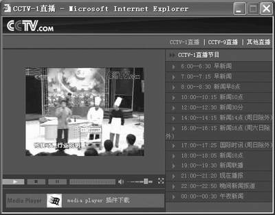 进入http://www.cctv.com/tvonline/media.html页面,我们每天都可以在这里同步收看中央电视台一套的13档新闻节目和央视九套的16档新闻节目(如图1所示),虽然收视窗口小了一些,但效果还是不错的。