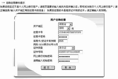 在注册页面按要求填入注册卡号、密码及身份证号码等内容,选择“提交”按钮,在其后的页面中确定后,即可成为工行的个人网上银行客户。自助注册的个人网上银行用户可使用除对外转账、个人汇款之外的所有功能,如果要增加这两项功能可以携带身份证件及注册卡去工行的营业柜台办理开通手续。