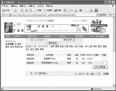 在IE地址栏中键入http://www.1pro.com.cn,来到万福隆超市的主页,如果你是第一次来到这里购物,那么需要点击“用户申请”按钮填写注册信息,注册是完全免费的,只要按照屏幕上的提示,填写各项信息。注意这里的个人信息请如实填写,因为这是日后下订单时的默认收货人地址以及确认信息。当注册成功后,点击“进入购物”按钮就可以开始购物了。