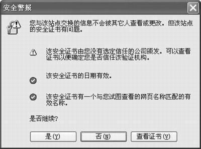 如果你希望经常从网上采购商品,那么笔者强烈建议朋友们开通信用卡的网络支付功能,可以登录各大银行的主页申请开户。由于前面讲述了工行的网上银行的使用,这里就以建设银行的网上支付功能为例,登录http://www.ccb.com.cn页面,选择左侧的“网上银行”项,接着会弹出(图3)对话框要求下载安全证书,目的是为了保证网络传输数据的安全性,并且具有防伪功能,然后进入下一页面,从“个人网上银行”中选择“个人开户申请”项,再根据系统的提示进行操作,很快就可以开通网上银行的功能了。