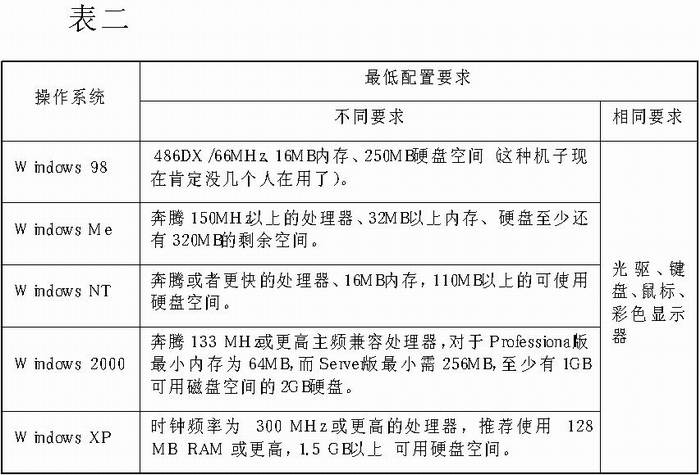 在考虑好第一个问题后,下面还要想想你的计算机硬件是否支持你想安装的系统。因为每一个系统对计算机硬件配置都有一个最低的要求,咱们可在系统软件所带的说明书中找到它的具体要求。像Windows XP推荐计算机使用时钟频率为300MHz或更高的处理器等等,具体情况见表二。