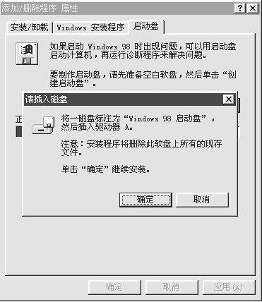 如不具有可启动性则需制作一张可启动软盘。制作方法很简单,在安装有Windows 98系统的计算机上,进入“控制面板”,双击“添加/删除程序”,然后在出现的窗口中选择“启动盘”标签,进入“创建启动盘”对话框(见图),此时插入软盘,然后单击“创建启动盘”按钮,待系统提示完成后便得到一张可启动软盘。
