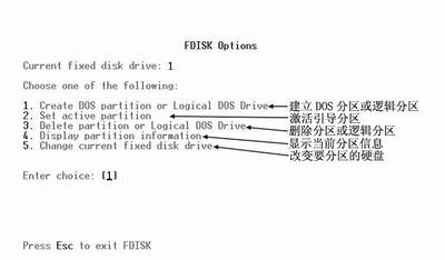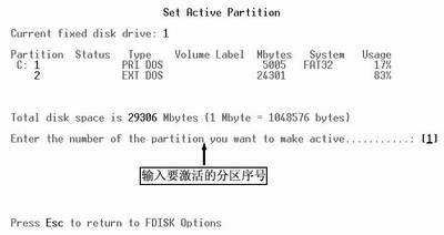 一个硬盘必须设置一个活动分区后才可以引导操作系统,因此再返回到“Fdisk Options”,在键盘上按“2”及回车键进入激活设置,在这里我们要把主分区C盘激活,因此我们可再在键盘上键入数字“1”(图9)。