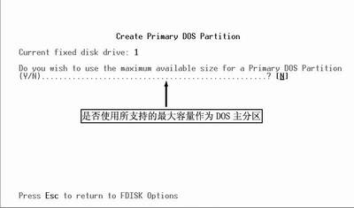 由于建立主分区为默认选项,因此我们可在图2的主界面中按回车键便可进入主分区设置。稍等一会屏幕显示图3所示的画面。由于我们不是把整个硬盘作为一个主分区,因此在这里可依次单击键盘上N键、回车键,待其检测再次完成后,可直接在键盘上输入这个主分区的大小(图4)。