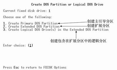 依次按键盘上“1”及回车键,此时出现如图5界面所示的,然后在键盘上按数字“2”,再按回车键进入扩展分区的创建。稍等片刻,出现如图3所示画面时,我们依次单击键盘上“Y”键及回车键同意把所余下的硬盘空间全部做成DOS扩展分区。
