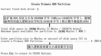 豆仔提示:在图4中设置分区大小时有两种方法:一种是直接输入数值,例如5GB可输入5000;另外一种是输入所占硬盘容量的百分比,例如5GB的空间大约占这个30GB硬盘的17%。主分区建立好后,单击键盘上的Esc键返回到主界面。