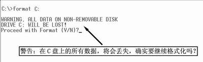 此时会出现一个被格式化盘数据全部丢失的警告。如果确实要进行格式化则单击“Y”。我们当然是单击“Y”确认进行对C盘的格式化。对其他盘符也同样采用此方法完成格式化。