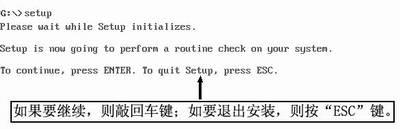 窗中最下端的信息提示我们如果要继续进行,则敲Enter键(即回车键),如要退出安装则敲Esc键。这里我们敲回车键继续。