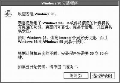 在界面左上端显示了安装的几个大步骤:Windows 98安装程序开始运行、收集计算机的相关信息、将Windows 98文件复制到计算机等,而在其左下端会显示完成全部安装所需的估计时间,我们按“继续”按钮进入Windows 98安装程序。