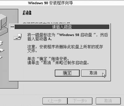 7.再往“下一步”后,便会弹出插入磁盘以制作启动盘的提示窗(图8),如果不想制作则单击“取消”钮,否则则插入磁盘,单击“确定”。由于我们在前面已经制作好了启动盘,因此在这里单击“取消”按钮继续。