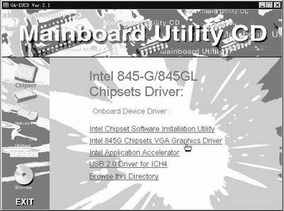 一般驱动程序光盘放入光驱后会自动弹出一个安装选择界面(对于驱动程序为可执行程序的多为Install.exe或Setup.exe,也可以直接找到该文件双击运行),我们在左栏选择“Chipset”,然后在右侧便可显示可选的安装项信息(图1)。