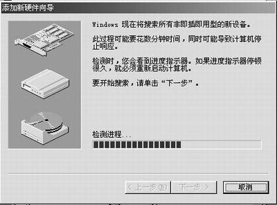 而对于没有可执行程序的驱动程序,我们可利用Windows添加硬件去安装驱动程序,方法是先进入控制面板,双击“添加硬件”,打开“添加硬件向导”,再单击“下一步”,直至进行硬件搜索(图3)。
