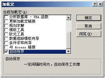 让Excel自动保存文件 硬件周刊 涟水 安装完Office2000后,Excel是不能自动保存文件的,Excel的自动保存设置与Word的设置是不一样的。如何让Excel也能自动保存文件?方法如下: ①点击“工具(T)”,选中“加载宏”,弹出图1所示的窗口。 ②选中“自动保存”,点“确定”,会弹出图2所示的窗口。 ③选中“是(Y)”,按提示插入Office2000光盘,完成设置,Excel就可自动保存文件了。