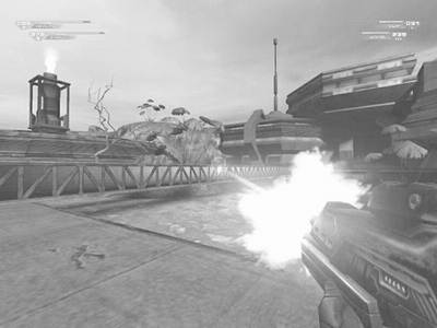 Radeon9000Pro:它有和Radeon7500一样的问题,材质载入过慢,因此在《Unreal2》中,将“World Texture”和“Object Texture”设置为“HIGH”后,游戏中不时出现明显停顿。因此我们将材质全部开为“Medium”。游戏速度大为改善,在1024×768下也非常流畅。硬件Pixel Shader使得Radeon9000Pro可以完美表现水面的反射效果,建筑物的倒影和枪口火焰在水面的反射效果都表现得淋漓尽致。
