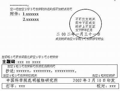 公文版记是指主题词及其主题词以下部分,置于公文最后一页,按排列顺序依次为:主题词、分栏线、抄送、印发机关和印发日期、印数。关于公文版记更详细的说明见图2和《国家行政机关公文格式》(GB/T 9704-1999)国家标准,这里就不多说了。