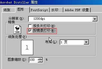 2)在Word2000/2002中排好版面后,单击“文件”菜单中的“打印”命令,在打印机名称中选Acrobat Distiller打印机,单击右侧的“属性”按钮,在弹出的“Acrobat Distiller属性”对话框的“图形”选项下选中“按镜像打印”前面的钩。