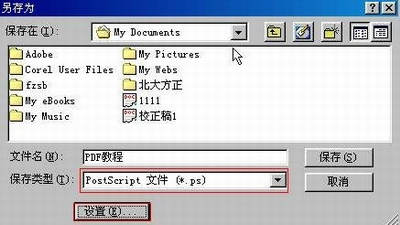 3)将制作好的PDF文档用Acrobat(注意,不是Acrobat reader)打开,在“文件”菜单中单击“另存为”命令,将保存类型设为“Postscript文件(*.PS)”,如有必要,单击“设置”按钮,在对话框的“字体纳入”选项中选“全部嵌入”,其他选项可选默认值。