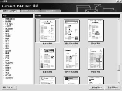 点击“开始”→“程序”→“Microsoft Publisher”,启动Publisher。启动后首先显示目录窗口,如图1所示。在这里,Publisher为我们提供了大量各种类型的模板,同时还提供了向导功能,我们可以选择所需的模板,根据向导的提示做出报纸的大框架,然后再进一步地修改、完善,这也可以使初学者更易上手。