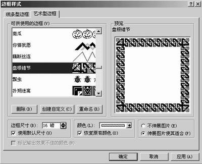 可能在输入文字的过程中,你会发现一个问题,模板预留的文字框的大小不太符合自己的需要,有的太大、有的太小,或者形状不够理想。那就点击文字框将它选中,然后用鼠标拉动文字框上的小方块来调整其大小和形状。如将鼠标放在边框上的其他位置,拖动鼠标,则可以改变文字框的位置。同样,在选中文字框的前提下,执行“格式”菜单中的相关命令,可以设置文字框的背景色、边框颜色、类型等。比如执行“格式”菜单中的“改变文字排列”命令,可以将文字进行横排、纵排的转换,如图5所示。执行“格式”菜单中的“线型/边框样式”──“其他线型/边框样式”命令,在打开的“边框样式”窗口中,可以为文字框添加“艺术型边框”,如图6所示。