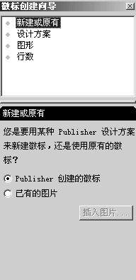 这是Publisher的一个特别功能,专门为你设计和制作自己公司的徽标,非常方便。打开最后一个版面我们会看到左侧的这个徽标,如图12所示。上面是一个小图形,下面是一排文字。如果你需要调整徽标的话,将光标放在徽标上面,用鼠标点徽标下面的小方框,就会出现“徽标创建向导”,如图13所示。