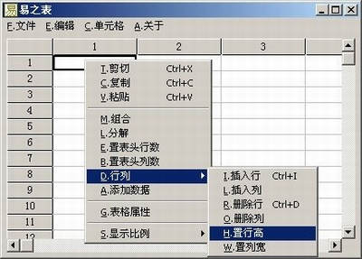 《易之表》的界面非常简朴,但该有的功能一点都没少。要指定单元格的大小非常简单,只需先选中一个或多个单元格,按鼠标右键选择菜单“行列→置行高”或“行列→置列宽”,输入相应的数值即可。注意,这里的单位是“0.1毫米”(如图1)。
