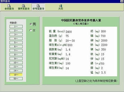 使用主界面上方的“查询”按钮,可以进入到“营养查询”界面。在此你不但可以按照食物的名称和包含营养素的多少来进行查询,还能够了解到各年龄段的人营养摄入量的标准,非常有利于我们有的放矢地调整营养结构。