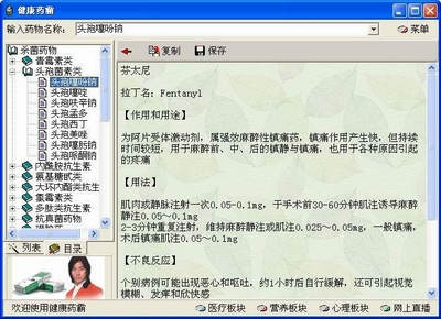 点击上方工具条上的“目录”按钮,在界面左侧的分类目录中查找需要的药品。如果你对药品的分类不是很熟悉的话,那么可以使用“搜索”按钮,在“搜索”框中输入药品名称的关键字,再点击“搜索”按钮即可。