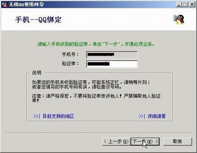 如果你希望用手机号码来登录,也要先将手机号码和你的QQ号码绑定,申请绑定的基本过程与E-mail绑定类似,前提是你所在地区已经开通了此服务(可到http://www.tencent.com上查看)。申请后会给你的手机发去一个包含验证字符串的短消息,你需要将此字符串输入在“手机—QQ绑定”窗口中,然后单击“下一步”完成绑定。当然,如果你的号码已被别的用户绑定,则会提示绑定失败。