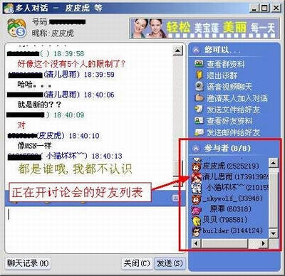 在窗口右下方的“参与者”区域中,你会看到所有参与讨论的好友的昵称,当然发出的消息所有的参与者都会看到。这里我再告诉你一个秘密,多人聊天J式中最多能够同时容纳8个人(而MSN Messenger只有5个人)。
