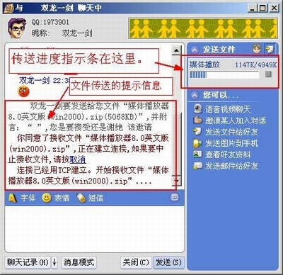 现在用我来传送文件会更方便:在聊天窗口中,单击侧边栏的“发送文件给好友”,然后找到目标文件添加进来(如果是单击多人聊天窗口中的侧边栏工具条,则要先选择文件的接收方),等待对方确认接收。确认后我会给你一个提示“连接已经用TCP建立”,当对方接收后传送进度指示条将出现在侧边栏的上方,你可以随时单击旁边的“停止”按钮来终止传送。传送过程和完成后,我都会用文字来提示相关的信息。
