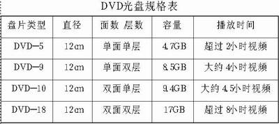 此外,按单/双面与单/双层结构的各种组合,DVD可以分为单面单层、单面双层、双面单层和双面双层四种物理结构,因此根据容量的不同可将DVD分成四种规格,分别是DVD-5、DVD-9、DVD-10与DVD-l8。单面DVD盘可能有一个或两个记录层,双面DVD盘上的数据分别存放在盘的上下两面。