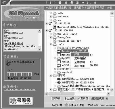 软件的主界面如图所示,软件提供了“自动搜索”、“深度搜索”和“快速搜索”三种搜索方式,单击“自动搜索”可直接在本地局域网中搜索可用的FTP服务器。如果搜索一无所获,可在“开始”和“结束”中输入要搜索的外网IP地址范围,然后单击“深度搜索”或“快速搜索”再次执行搜索。笔者强烈建议选择“深度搜索”,虽然其搜索速度稍慢,但却非常准确,而且能搜索到更多的资源。搜索完成后,单击“+”号可查看该FTP上的文件内容,在文件上单击右键,选择“打开”即可下载文件。单击“导出结果”可将搜索到的IP地址保存为html文件,留待以后使用。