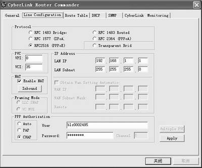 4.将Protocal方式选为RFC2516(PPPoE),此时NAT栏即显示为可更改状态,PPP Authorization栏也显示为可更改状态。在NAT栏选中Enable NAT,使局域网中其他电脑可以访问ADSL Modem(也就是开启路由功能);PVC栏下的VPI和VCI选项为电信设定,不用更改,也不能乱改,否则上不了网,IP和网关照用原来的,也不用更改。同时Framing Mone栏自动变为不可更改状态,不用管它。将电信给你的用户名和密码填入PPP Authorization栏中,点击Apply,系统即开始变更设置并保存。