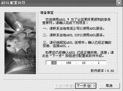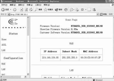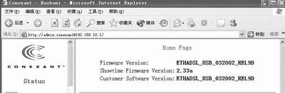 在浏览器地址栏中敲入http://192.168.10.1(默认的实达ADSL Modem IP地址,先要将网卡的IP设置为同一个网段,例如笔者的网卡IP设置为192.168.10.2),弹出一个要求输入密码的对话框,输入默认的用户名和密码,进入ADSL Modem的Web设置页面。
