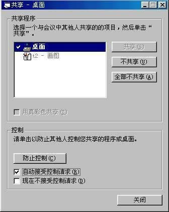 一是通过学生机Netmeeting“共享”中的“共享程序”和“控制”来实现对学生机的远程操控,设置如图3。这时该学生机必须只接受教师机的“请求控制”,拒绝其他学生对该机的控制权请求(采用这种方式的弊端是其他学生机都会接收到该机的共享桌面,干扰使用。优点是教师为该学生解决问题的过程其他学生都能看到)。
