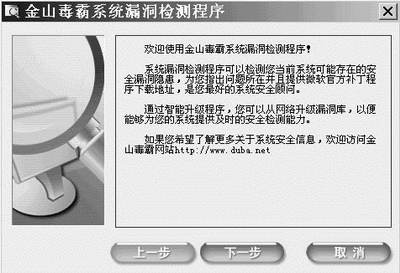 第一种方法确实不错,但是对于拨号用户就不太好了,因为网络速度实在太慢。不过在《金山毒霸2003》中提供了一个系统漏洞扫描程序(图2)。启动后,按“下一步”按钮就可以搜索系统中的错误,并告诉你官方下载地址,然后你就可以下载了。如果你的系统中没有漏洞或者已经安装完各种补丁,则会出现图3所示的画面。