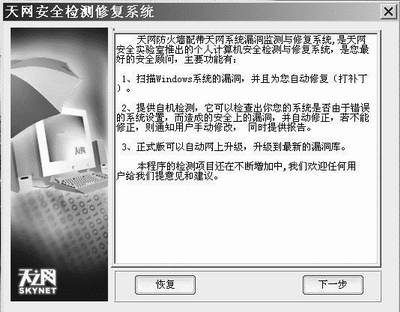 和金山毒霸一样,天网防火墙也提供了系统漏洞填补程序,核心文件名也是Syspatch.exe(图4),而且也可以独立运行。但是不同的是,它并不是用微软官方的下载补丁修补Windows的,因此它提供了一个“恢复”按钮,可以恢复到天网修补以前的状态。这样,如果你以后有了更好的系统修复程序或者官方补丁就不会和天网防火墙冲突了。