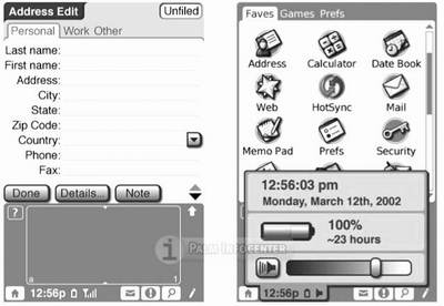 理论上的说词可能过于枯燥,近日,国外著名的Palm专业网站Palminfocenter.com上刊登了两张可能是Palm OS 6界面的截图(见图2),虽然没有得到证实,但是不妨从中增加一些对Palm OS 6的直观感觉。从图中我们可以看到Palm OS 6采用了虚拟手写区、以及更华丽的图形操作界面,看起来更加清新美观,在部分菜单的安排方式上还颇有一些BeOS的风格(见图3)。除此外,在图片的一些细节上似乎还印证了PalmSouce公布出的部分特性。如图2展示的新版地址本程序的下方,拥有手机上常见的网络信号强度栏以及信封标志(不知是代表短消息还是E-mail),而右图则表明了Palm OS 6可以在Launcher界面下直接查看时间、电池状态并进行声音控制,这是否暗示了Palm OS 6将会具有多任务处理能力?我们拭目以待。