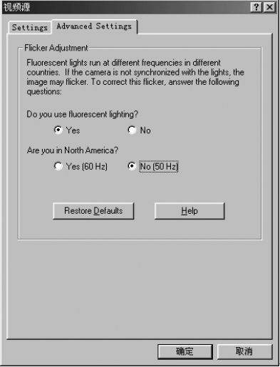 通过试验笔者发现,在该选项中的第一个项目中选择“Yes”(默认是“No”),然后在第二个项目中选取“No(50Hz)”,单击“确定”,这时再用来拍摄电视节目,那拍摄后的录像在回放时就不会出现令人讨厌的水平条纹干扰。原来,在安装CS331的驱动之前出现条纹干扰,那是由于我们使用的市电的工作频率是50Hz,而摄像头与电视机工作频率又不同步(估计是驱动不完善的缘故)造成的;安装CS331的驱动并选择合适的选项(即频率为“50Hz”),两者工作频率就同步了,干扰条纹也就随之消失了。