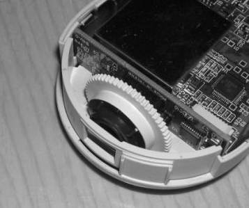 卸下CS330底部的两个小螺钉,即可把底座拆除,在调焦旋钮外侧(即远离电路板的那侧)包裹在镜头周围的黑色塑料环上有两个塑料突起(图4),正是这两个突起物限制了调焦旋钮的转动调节范围。把图4中左侧的突起用锉刀锉平后,可把微摄距离缩小到3cm左右,如果想进一步缩短微摄距离,可以把右侧的突起也锉平,这样镜头伸缩就不再受到限制。据笔者实测,CS330经上述改制后,在保证一定成像质量的情况下,微摄距离可缩短到1cm左右,都赶上Nikon 995的水平了(当然,虽然CS330的拍摄质量不错,但仍是不能与Nikon995相提并论的)!